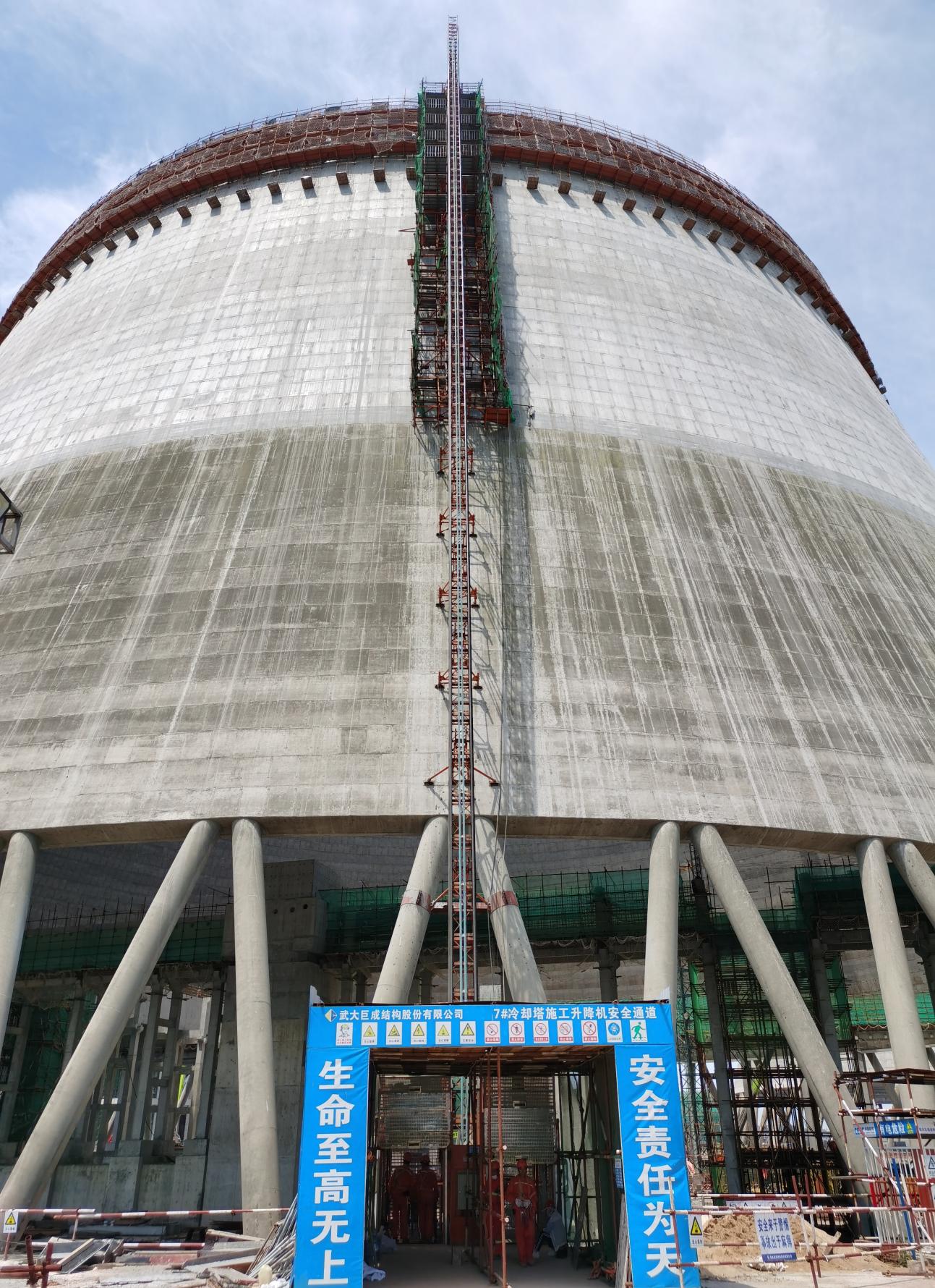 豐城電廠7#冷卻塔因發(fā)生過特大安全生產(chǎn)事故,為各方所關(guān)注。2020年復(fù)工后,巨成結(jié)構(gòu)憑借過硬的技術(shù)實(shí)力,榮譽(yù)承接了冷卻塔筒壁設(shè)計(jì)與加固工程。該工程屬于高危項(xiàng)目,開工前,巨成結(jié)構(gòu)的設(shè)計(jì)方案和施工組織設(shè)計(jì)均通過了專家論證。其中采用的多項(xiàng)巨成專有技術(shù)也得到了各位專家的認(rèn)可,如:擴(kuò)孔自鎖錨固技術(shù)保證新舊混凝土緊密結(jié)合、補(bǔ)償收縮細(xì)石混凝土保證施工質(zhì)量、便攜式鋼平臺保證施工安全、曲線施工升降機(jī)保證垂直運(yùn)輸。