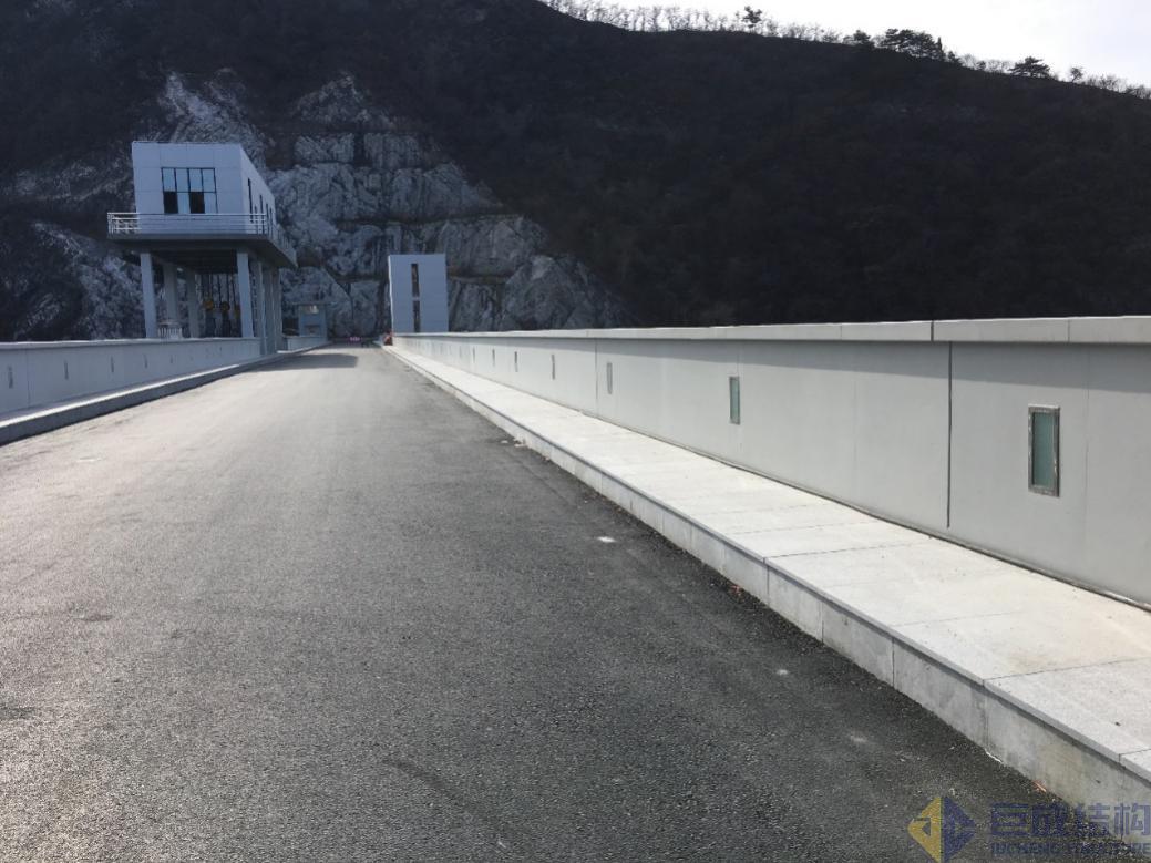 觀音閣水庫是東北著名的大型水庫,壩頂建筑彩鋼板銹蝕嚴(yán)重,大壩其它位置外立面也較為破敗。遼寧省相關(guān)領(lǐng)導(dǎo)在了解清水混凝土效果后,認(rèn)為符合觀音閣大壩整體風(fēng)格。2016年委托巨成結(jié)構(gòu)對其進(jìn)行改造。溢流壩啟閉機(jī)室外墻采用現(xiàn)澆清水混凝土,大壩采用涂裝清水混凝土,防浪墻采用后澆清水混凝土。大壩改造后山水渾然天成,水庫成為4A級景區(qū)。