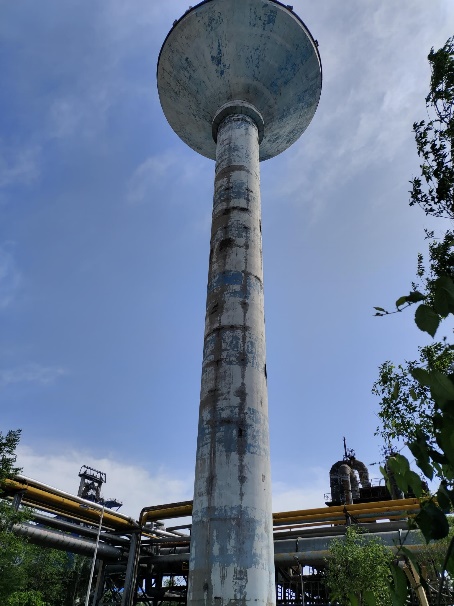 新疆天山鋼鐵巴州有限公司簡稱“巴州鋼鐵”,巴州鋼鐵煉鋼廠內(nèi)有一座事故水塔。水塔為鋼筋混凝土筒體結(jié)構,上部主要是倒錐形水箱,水箱檐口直徑14.62米,下部為圓柱形支筒,支筒外徑3.22米,水塔頂高度為43.08米。該水塔建于2011年,歷經(jīng)10余年的風吹雨打、酷暑嚴寒,水塔主體結(jié)構有多處老化和損傷,橫豎裂縫總長達187米之多。水塔成為鋼鐵廠的高危建筑,加固水塔成為巴州鋼鐵的一件心頭大事。