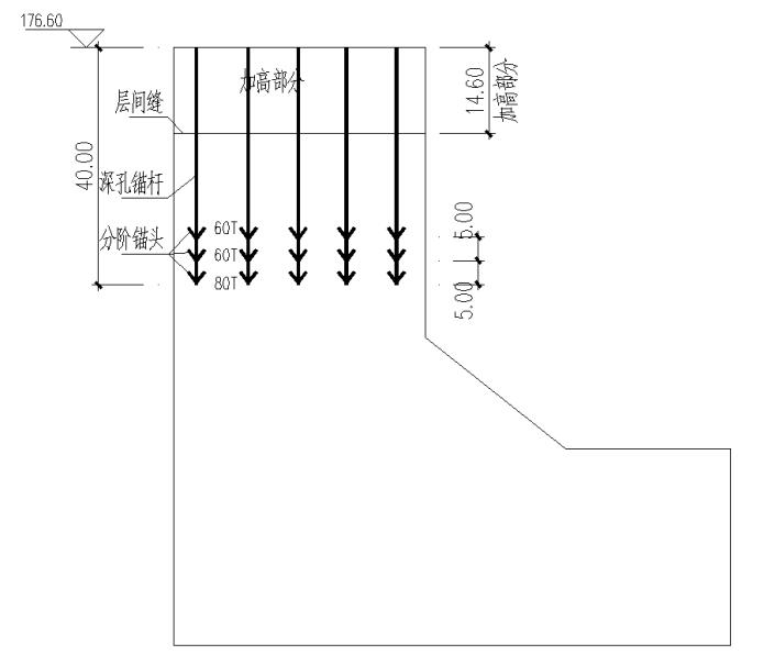 根據(jù)設(shè)計(jì),閘墩新增1000噸預(yù)應(yīng)力根據(jù)計(jì)算每個(gè)閘墩增加1000噸預(yù)應(yīng)力,長度45m,每個(gè)閘墩5孔,每孔200噸。內(nèi)錨頭分為3層,3層內(nèi)錨頭上下分布間距間隔5m,底層80噸,上面兩層各60噸。