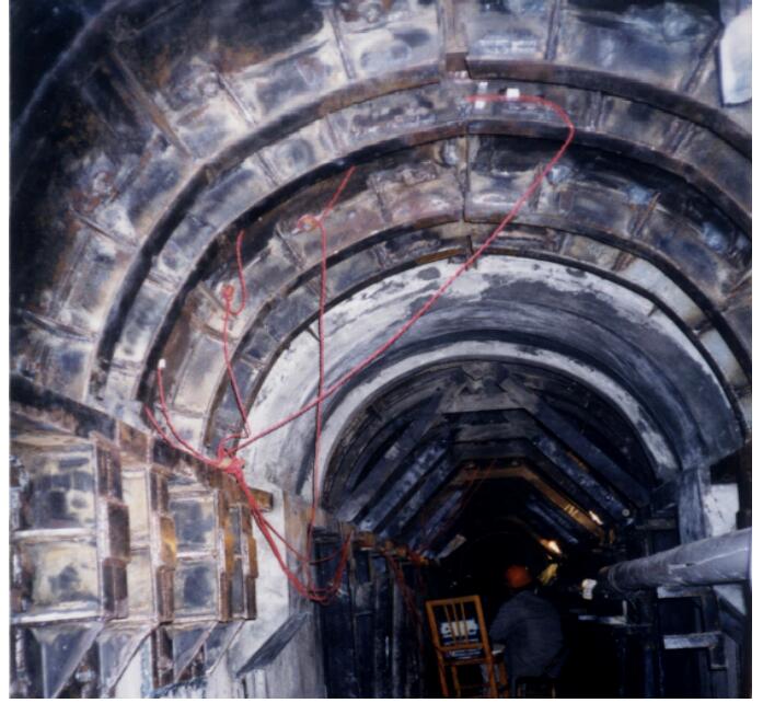 電站運(yùn)行一段時(shí)間后,現(xiàn)場發(fā)現(xiàn)預(yù)制混凝土拱頂出現(xiàn)了沿廊道軸向方向的縱向裂縫,預(yù)制拱與現(xiàn)澆邊墻交接處混凝土出現(xiàn)剝落,這對(duì)廊道的安全運(yùn)行構(gòu)成了威脅。最后采用巨成公司自鎖錨桿將加固用鋼板進(jìn)行錨固,場地解決問題。本項(xiàng)目2000年實(shí)施,使用自鎖錨桿4.6萬只,是擴(kuò)孔自鎖錨桿的第一次大規(guī)模應(yīng)用。
