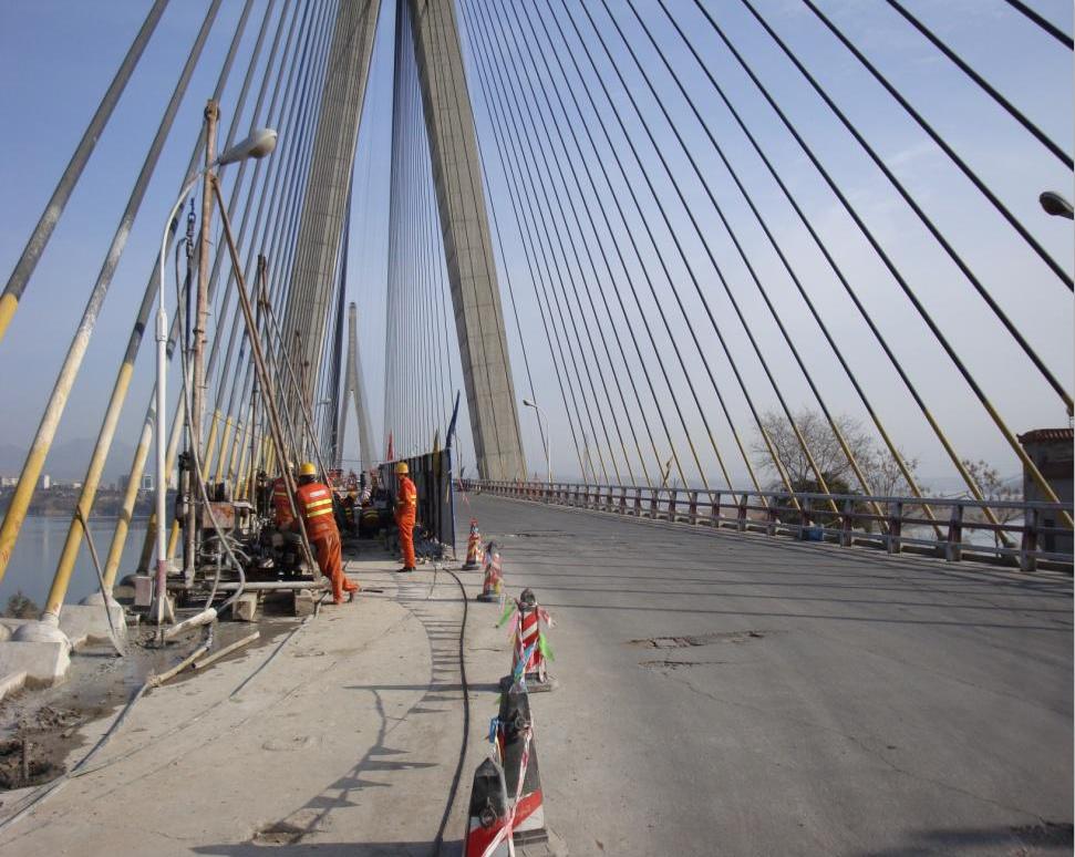 鄖陽(yáng)漢江公路大橋位于湖北?堰市,是209國(guó)道上的重要橋梁,1989年11月動(dòng)工,1994年2月通車。后發(fā)現(xiàn)箱型墩側(cè)壁出現(xiàn)側(cè)向裂縫,原因分析可能是預(yù)應(yīng)力失效所致。應(yīng)用武大巨成公司預(yù)應(yīng)力自鎖錨桿對(duì)橋臺(tái)進(jìn)行加固,單根自鎖錨桿預(yù)應(yīng)力為561kN。
