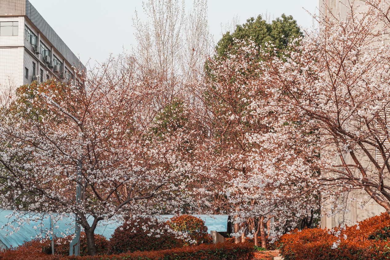 “珞珈山水,巨成之源”,巨成在大樓旁廣種櫻花樹,陽春三月,櫻花盛開,生機勃勃,鳥語花香!