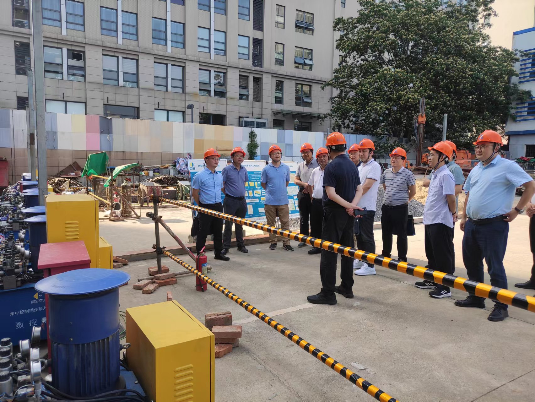 陳總一行首先考察了巨成群控同步頂升工程試驗項目現(xiàn)場,副總經(jīng)理張暢介紹了頂升試驗的背景、目的和群控同步頂升大型數(shù)控設備以及頂升應用前景。雙方對鋼滑道頂升技術和應用場景展開了深入的討論和交流,大家一致認為巨成群控同步頂升技術能夠在城市更新、老舊小區(qū)改造以及橋梁頂升等領域發(fā)揮重大作用。
