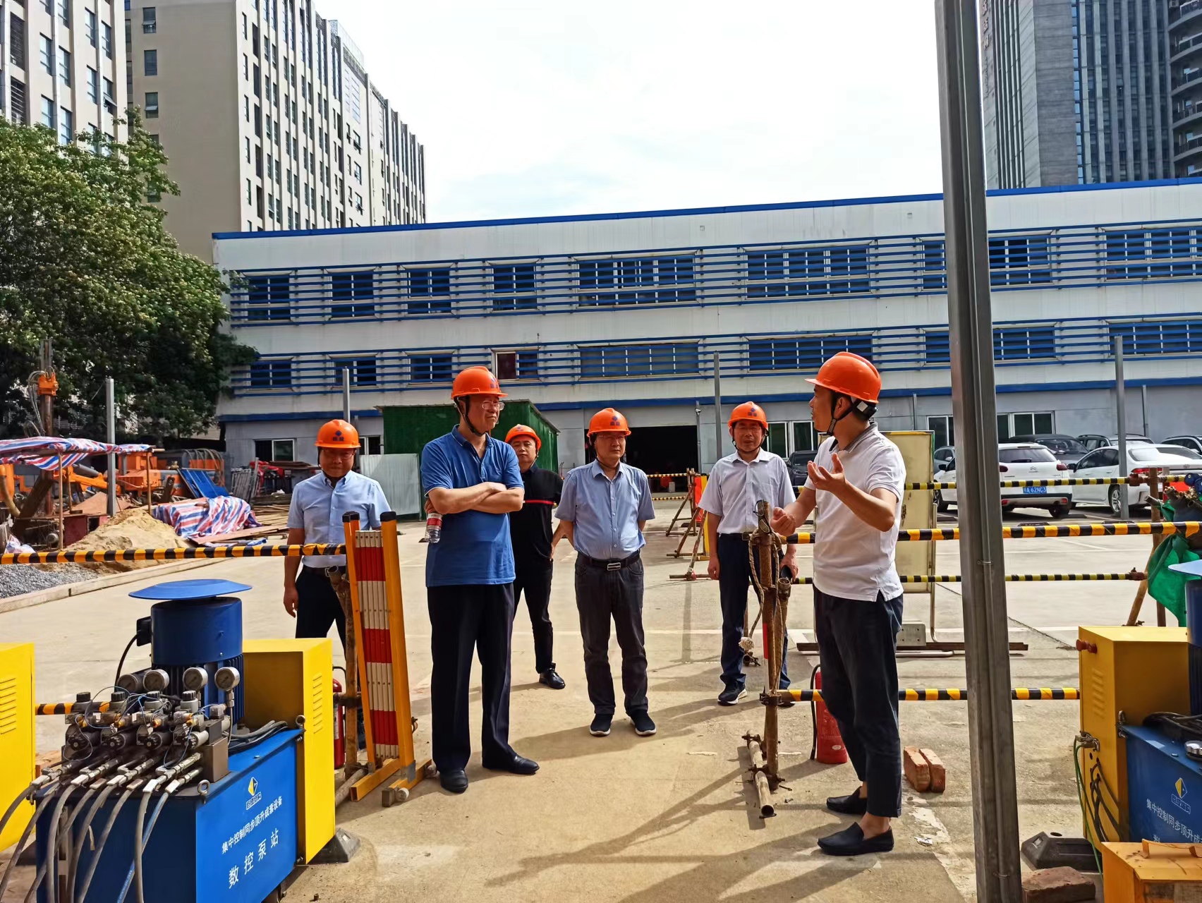 梅院長一行首先來到巨成群控同步頂升工程試驗(yàn)項(xiàng)目現(xiàn)場,巨成研究院院長助理周志勇介紹了頂升試驗(yàn)的背景、目的和技術(shù)方案。雙方就鋼滑道頂升技術(shù)對砌體結(jié)構(gòu)頂升增層的設(shè)計(jì)方法和施工技術(shù)展開了交流和討論,特別是對托盤梁的受力模型進(jìn)行深入探討。大家一致認(rèn)為巨成鋼滑道頂升技術(shù)能夠在城市更新、老舊小區(qū)改造等領(lǐng)域發(fā)揮重大作用。